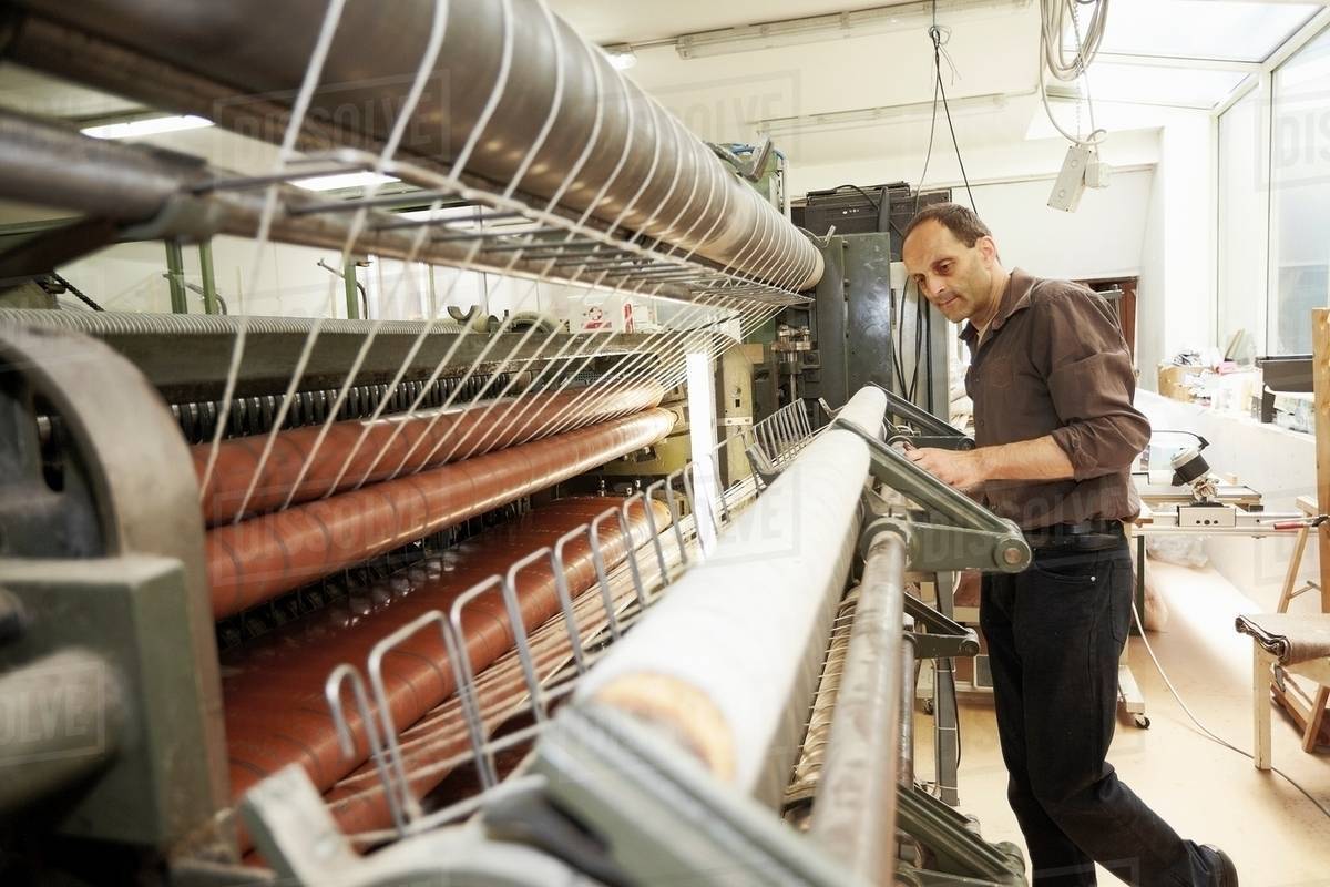 Worker using machine in wool factory Royalty free Stock Photo Dissolve