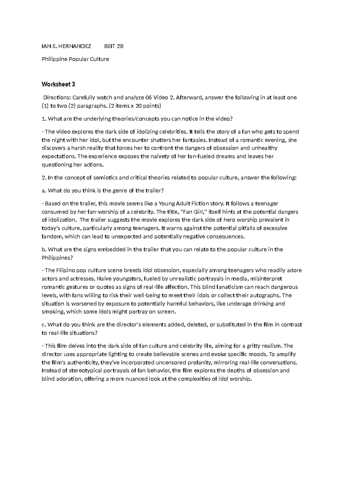 PPC worksheet 3 IAN S HERNANDEZ BSIT 2B Philippine Popular Culture