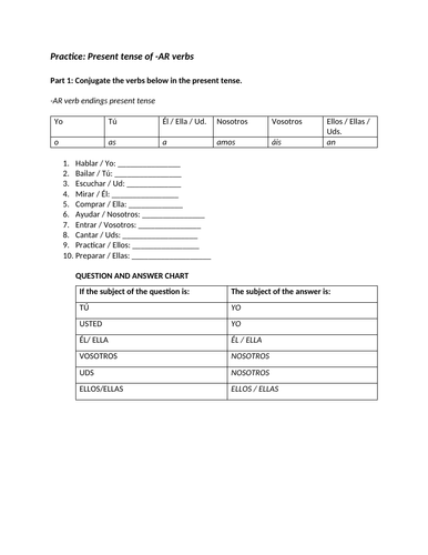 Practice: Present tense of AR verbs Teaching Resources