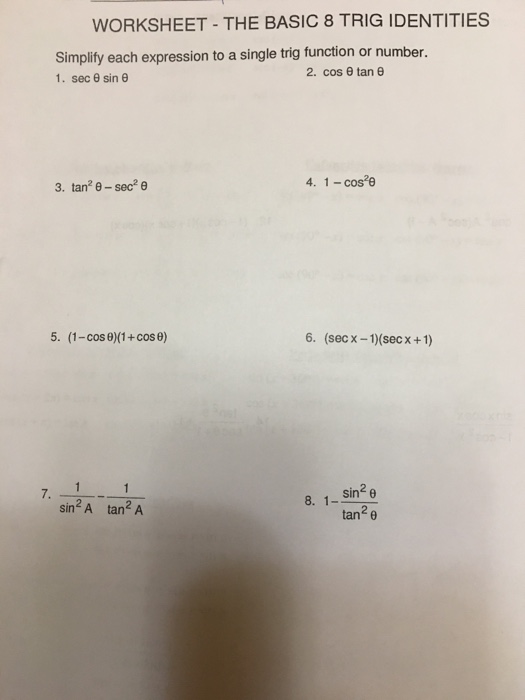 Solved WORKSHEET THE BASIC 8 TRIG IDENTITIES Simplity each Chegg com