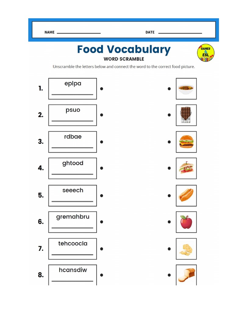 Food Word Scramble Activity for Kids 15 Words Free Printable PDF