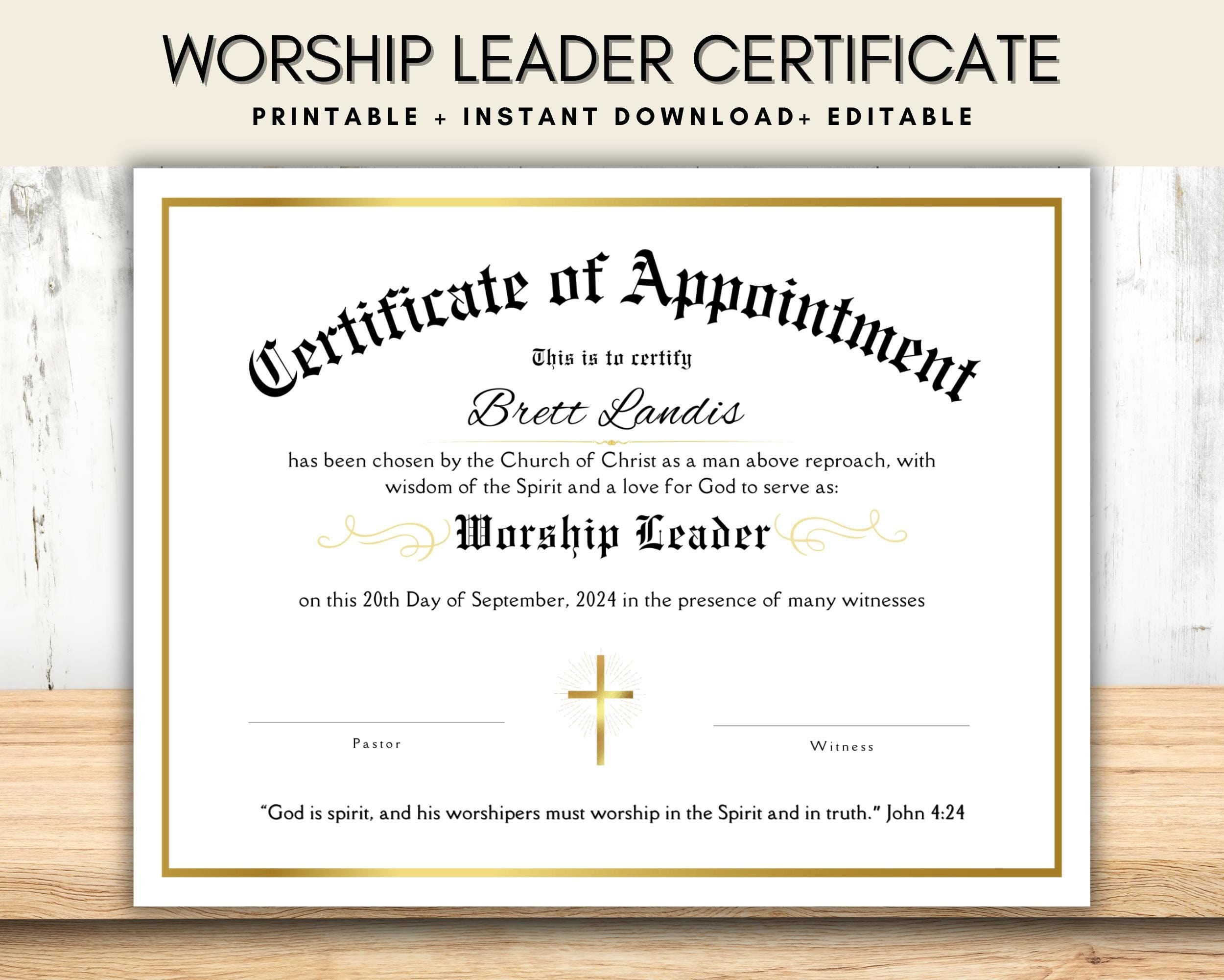Worship Leader Certificate Editable Certificate for Church Worship