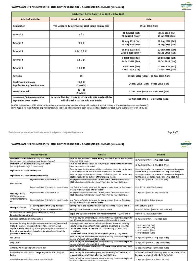 WOU ODL Academic Calendar Jul 2018 PDF Academic Term Academia