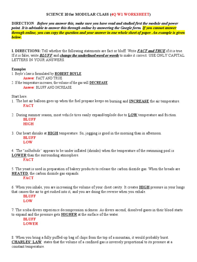 4Q W1 WORKSHEET With ANSWER KEYS PDF Gases Temperature