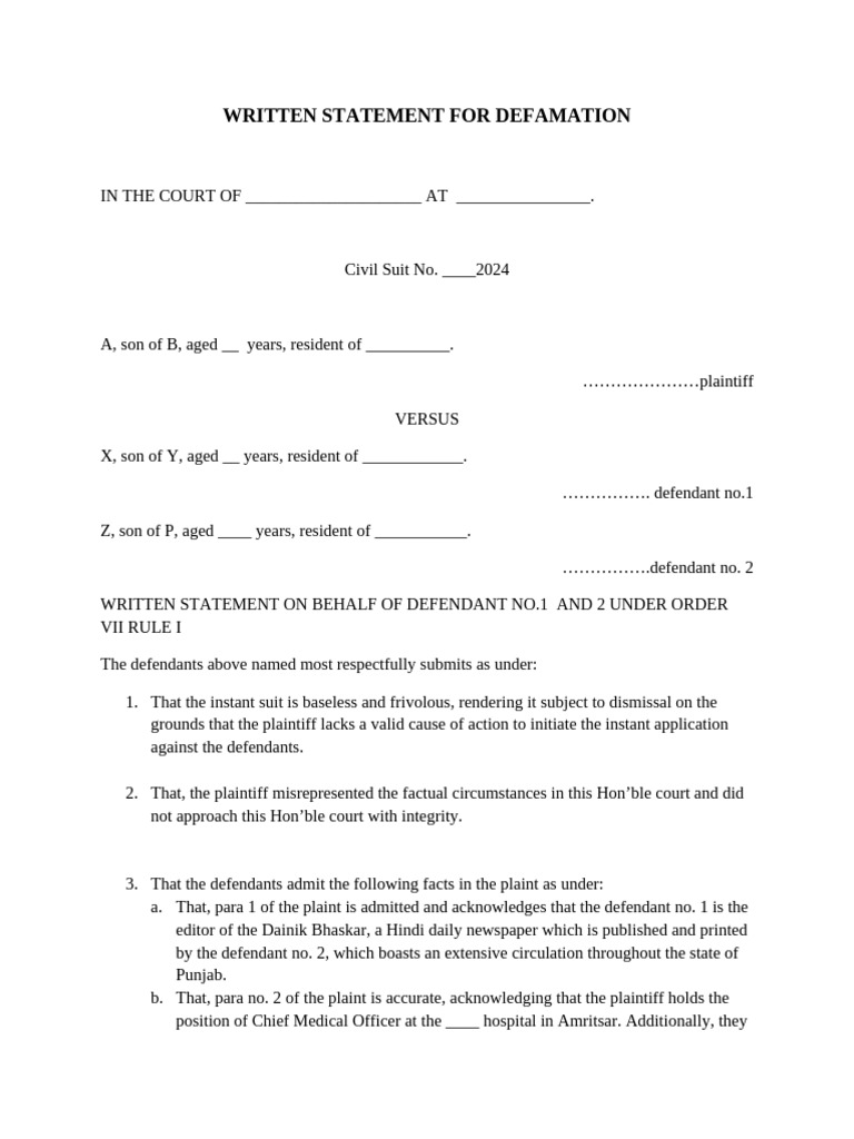 Written Statement For Defamation PDF