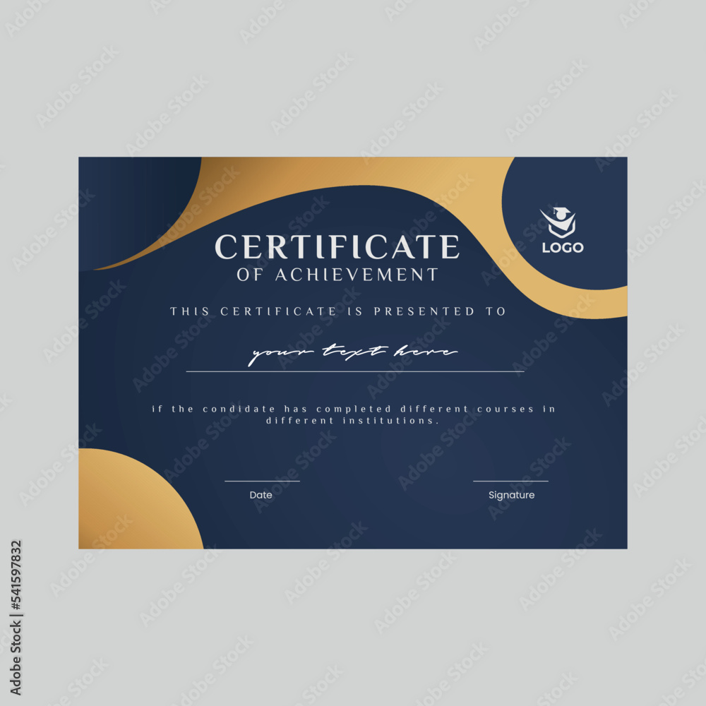 Blue and gold certificate of achievement template with gold badge and