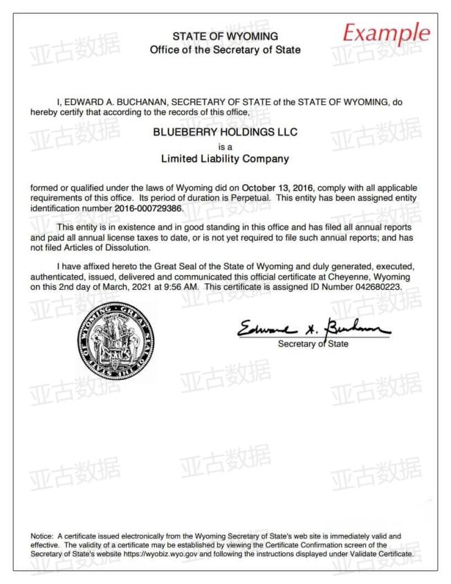 美国怀俄明州(Wyoming)公司Good Standing证书 良好存续证明 亚古数据