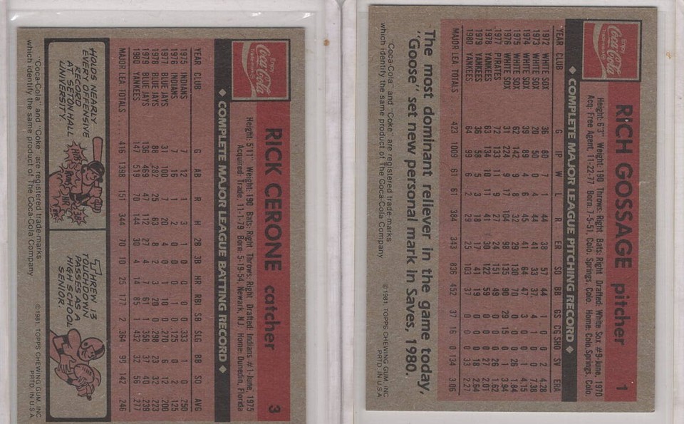 1981 Topps Coca Cola New York Yankees Promo rick cerone rich gossage