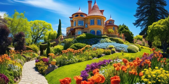 Stunning Floral Garden Design in Front of Beautiful House Premium AI