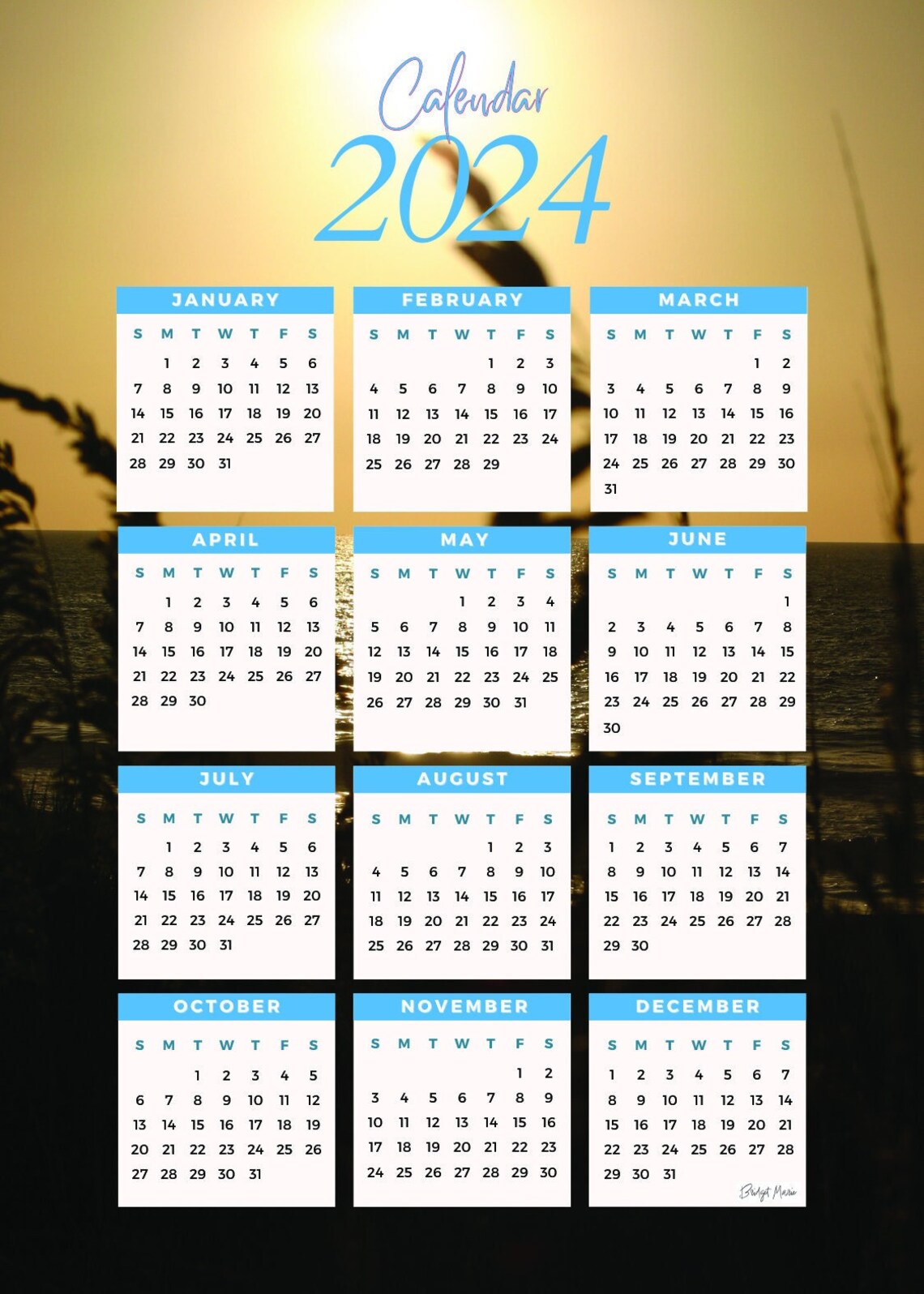 Printable Minimalist 2024 Calendar Outer Banks Ocean Seaoats Year at a