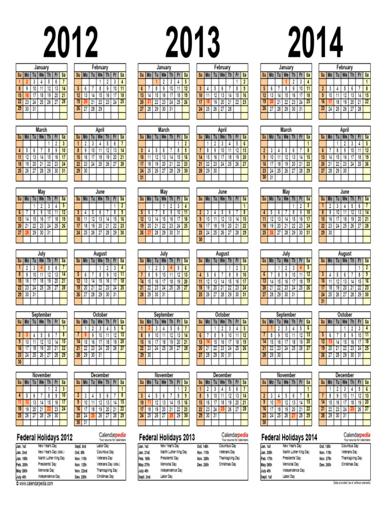 2012 2014 Three Year Calendar Free Printable PDF Templates