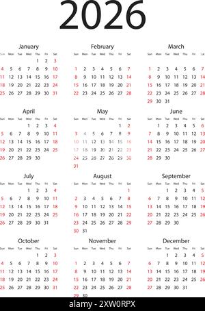 Simple 2026 year calendar week starts on Sunday Stock Vector Image