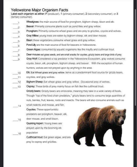 Solved Yellowstone Major Organism Facts Label each organism Chegg com