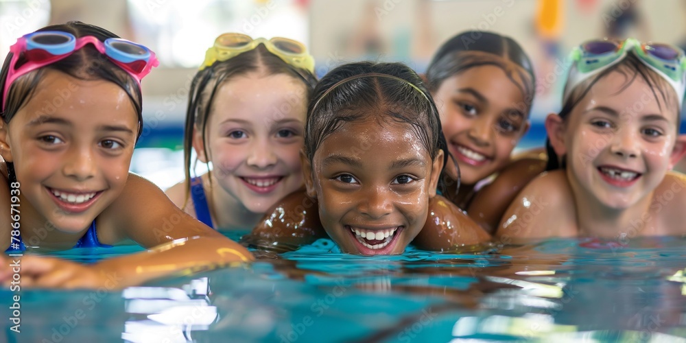 Portrait Of A Group Of Young Children Cheering During A Swimming Lesson