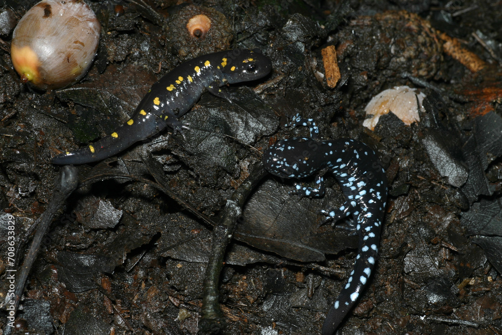 Two young salamanders on a damp forest floor: On the left is a spotted