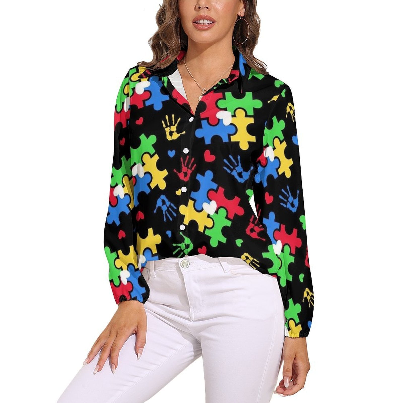 Autism Awareness Colorful Puzzle Piece Long Sleeve Blouse Woman